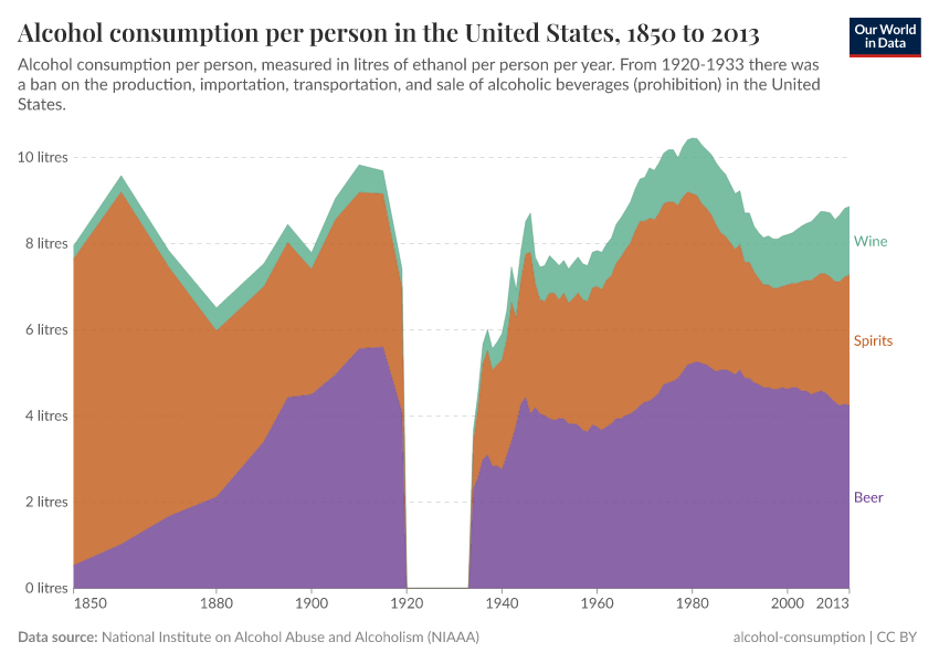 Over this long time period, we see that per capita drinking quantities have been relatively constant — typically averaging around 8 to 9 liters per year. Over the period 1920-1933, there was a ban on the production, importation, transportation, and sale of alcoholic beverages in the United States (known as the 'National Alcohol Prohibition'). Since the statistics here reflect reported sales and consumption statistics, they assume zero consumption of alcohol over this time. However, there is evidence that alcohol consumption continued through the black market and illegal sales, particularly in the sales of spirits. It's estimated that at the beginning of Prohibition, alcohol consumption decreased to approximately 30 percent of pre-prohibition levels but slowly increased to 60-70 percent by the end of the period.3