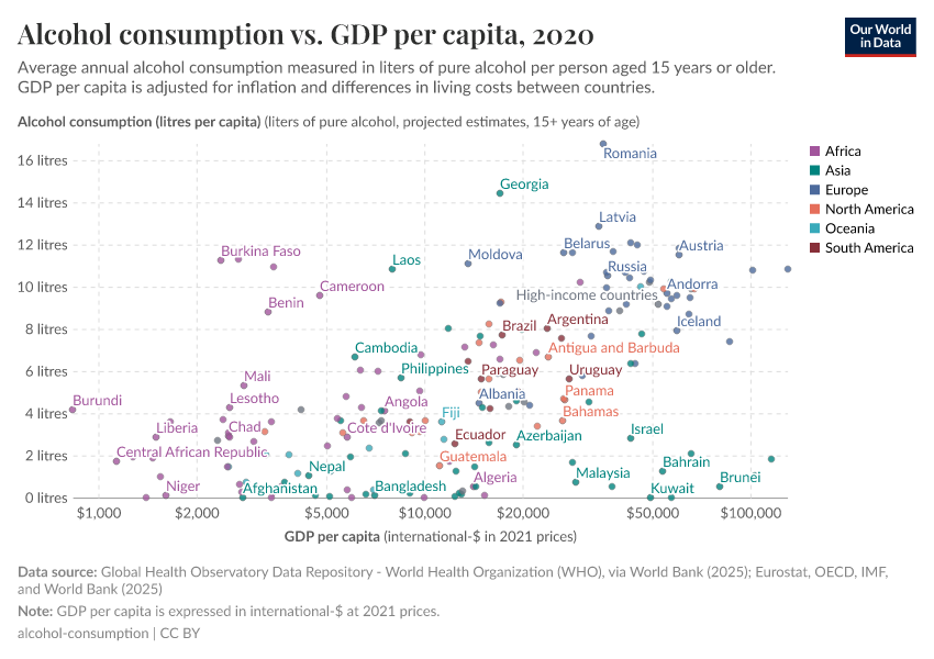In the chart, we see the relationship between average per capita alcohol consumption – in liters of pure alcohol per year – versus gross domestic product (GDP) per capita across countries.