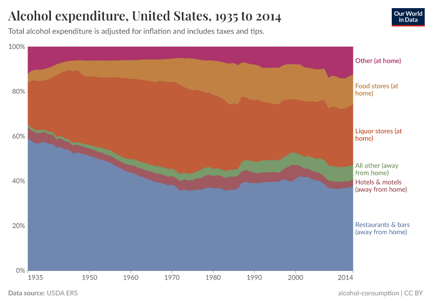 This shows the expenditure on alcohol in the United States, differentiated by where the alcohol has been purchased and consumed.