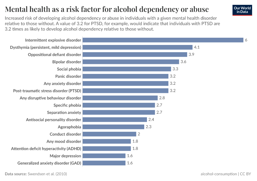 The results in the chart show the increased risk of developing alcohol dependency (we show results for illicit drug dependency in our topic page on drug use) for someone with a given mental health disorder (relative to those without). For example, a value of 3.6 for bipolar disorder indicates that illicit drug dependency became more than three times more likely in individuals with bipolar disorder than those without. The risk of an alcohol use disorder is highest in individuals with intermittent explosive disorder, dysthymia, ODD, bipolar disorder, and social phobia.