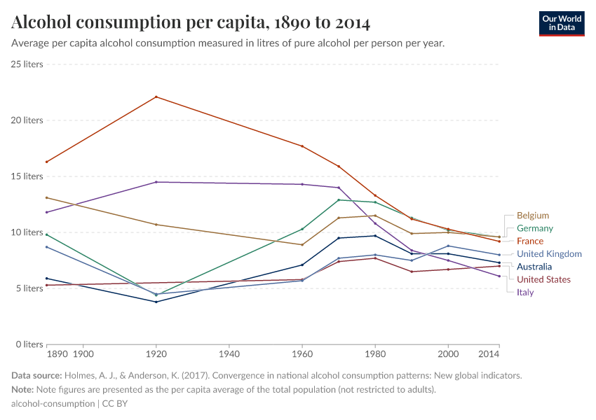 The chart shows alcohol consumption since 1890 in a number of countries.