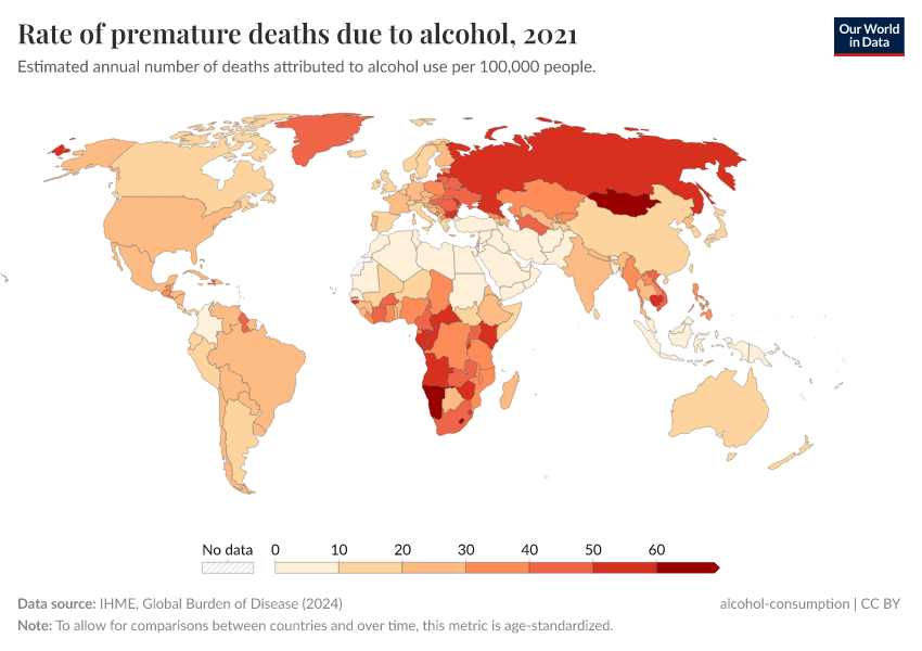 We see large geographical differences: Alcohol consumption across North Africa and the Middle East is particularly low — in many countries, close to zero. At the upper end of the scale, alcohol intake across Europe is higher.