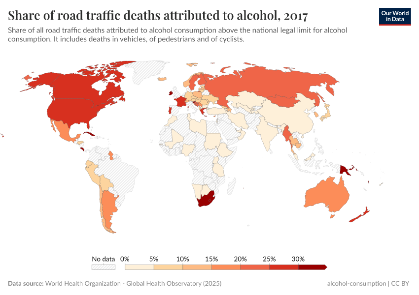 The map shows the share of all road traffic deaths attributed to alcohol consumption over the national legal limit for alcohol consumption.