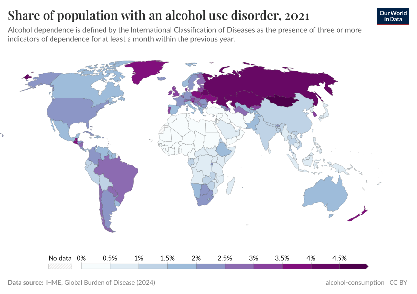 This interactive map shows the share of adults who drink alcohol. This is given as the share of adults aged 15 years and older who have drunk alcohol within the previous year.
