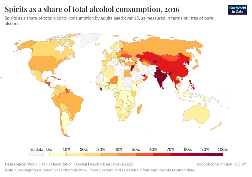 The first map shows this in terms of spirits as a share of total alcohol consumption. In many Asian countries, spirits account for most of total alcohol consumption.