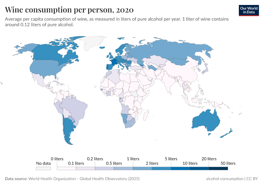 This interactive map shows the annual average alcohol consumption of alcohol, expressed per person aged 15 years or older. To account for the differences in alcohol content of different alcoholic drinks (e.g., beer, wine, spirits), this is reported in liters of pure alcohol per year.