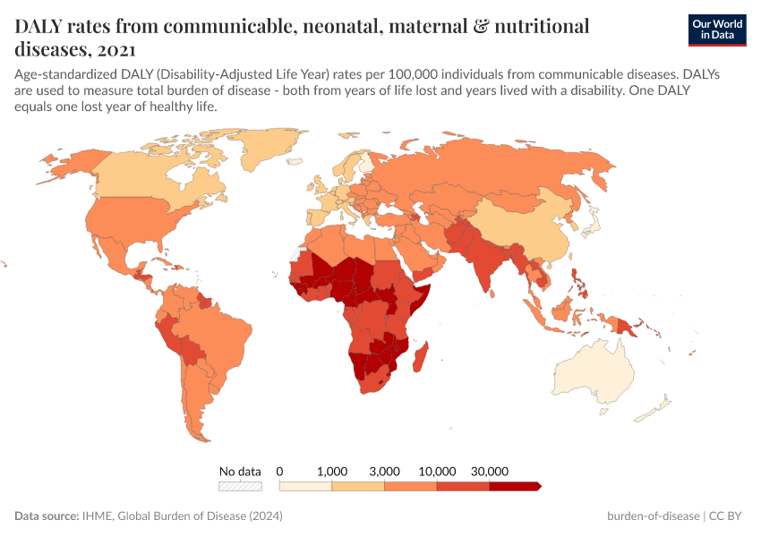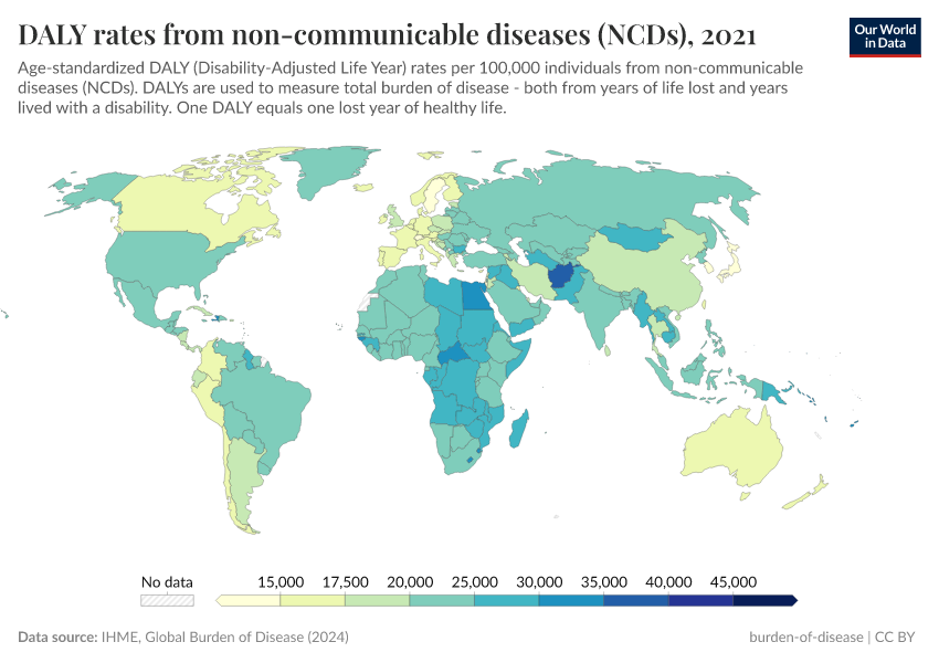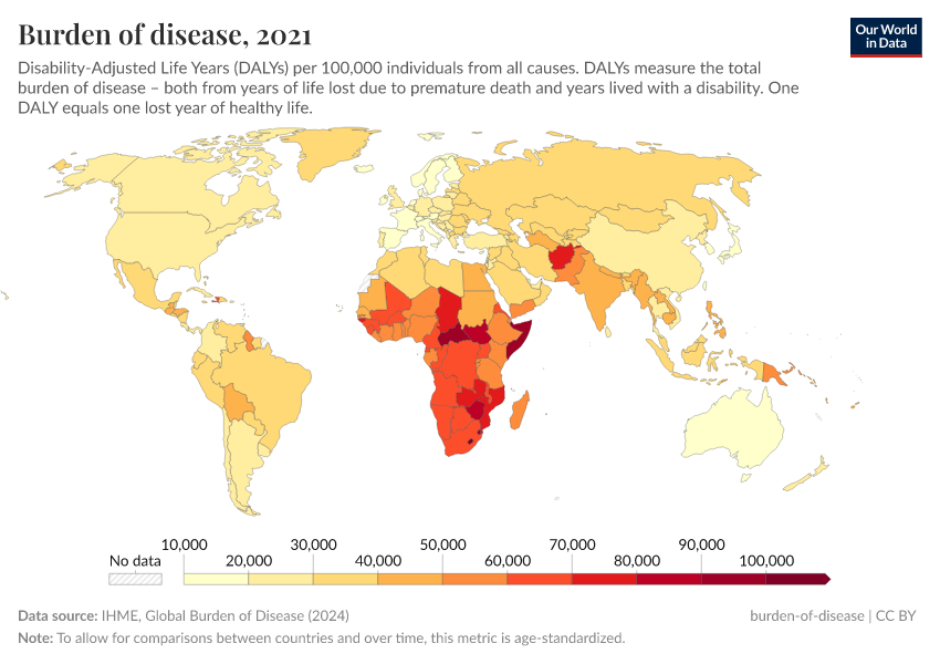 This map shows the annual rate of DALYs per 100,000 people in the population. It is thereby measuring the distribution of the burden of both mortality and morbidity around the world.
