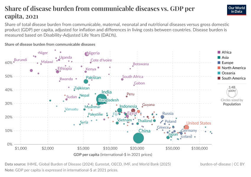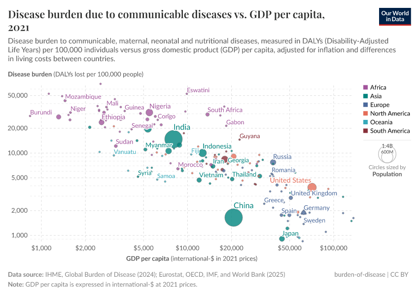 The burden of disease due to communicable diseases vs GDP per capita is shown in the following charts.