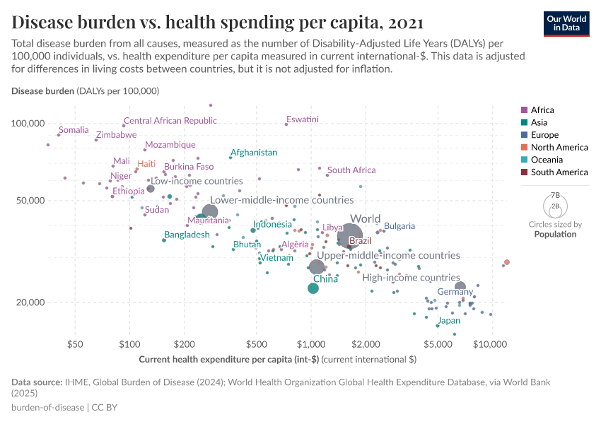 The chart below shows the relationship between the total burden of disease versus average health expenditure per person, measured in US dollars.