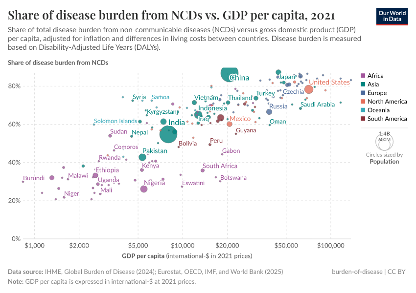 However, NCDs also constitute a higher share of disease burden at higher incomes. This is because communicable diseases decline more greatly with income than non-communicable diseases do.