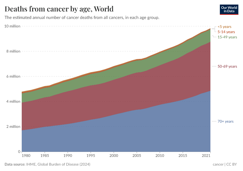 The world has seen a rise in cancer deaths over time, as the chart below shows. This comes largely from more deaths in the oldest age groups as populations have been growing and aging.