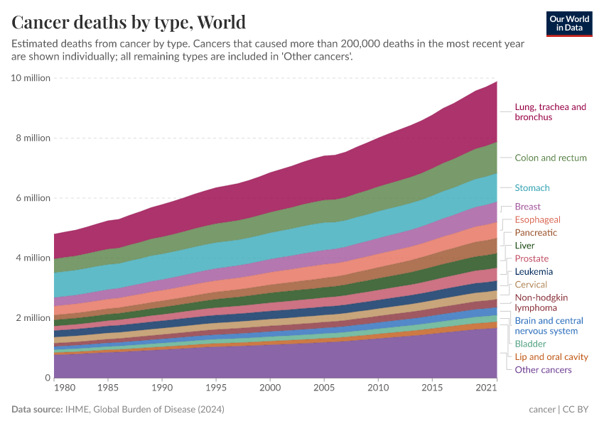 On this page, we explore global data and research on different types of cancer. This can help us better understand the risk factors for cancer, how cancer risks vary across the lifespan, how they differ worldwide, and how they have changed over time.