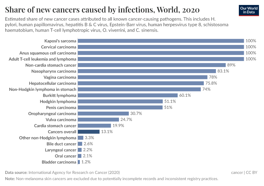 You can see that, for some cancers — such as Kaposi’s sarcoma, cervical cancer, T-cell leukemia and lymphoma, and non-cardia stomach cancer — it’s estimated that all, or almost all, cases are caused by pathogens.