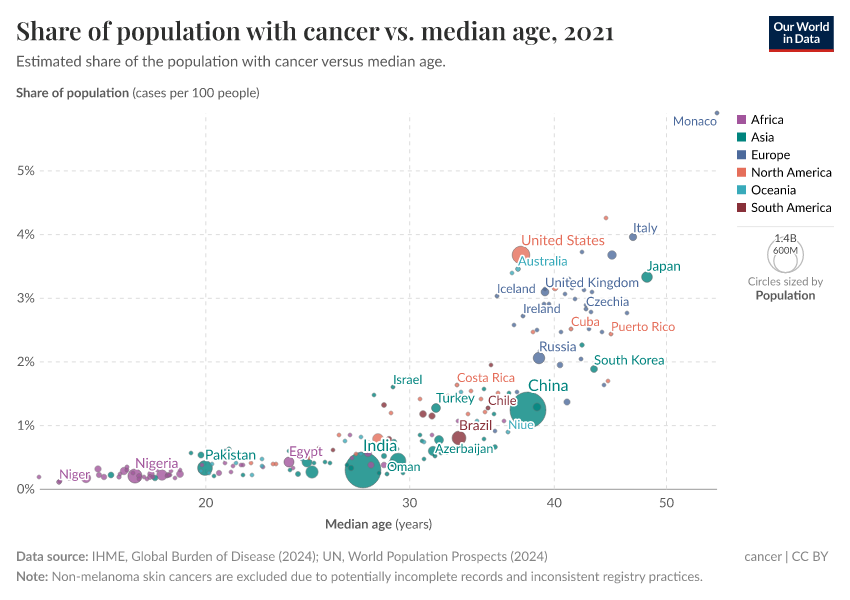These factors mean that countries with older populations tend to have a higher prevalence of cancer. This is shown in the chart below.