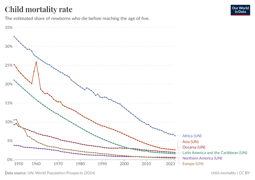 But 1950 was also a divided world. Child mortality rates across the rest of the world were still unimaginably high. With one-in-three children (sometimes higher) dying in their first few years, most parents across Africa, Asia and much of South America were probably still losing several children.