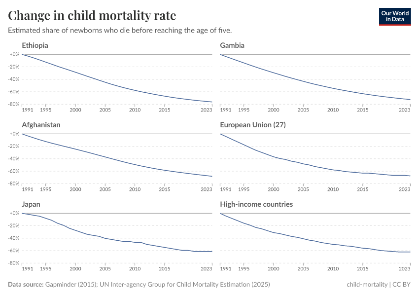 In the previous chart, progress in the EU looked a little underwhelming. But, in fact, rates have fallen by 69%. Even in Japan, one of the safest countries to be born in, child mortality rates have dropped by almost two-thirds. Those are not small reductions. Children are much less likely to die than they were in 1990.