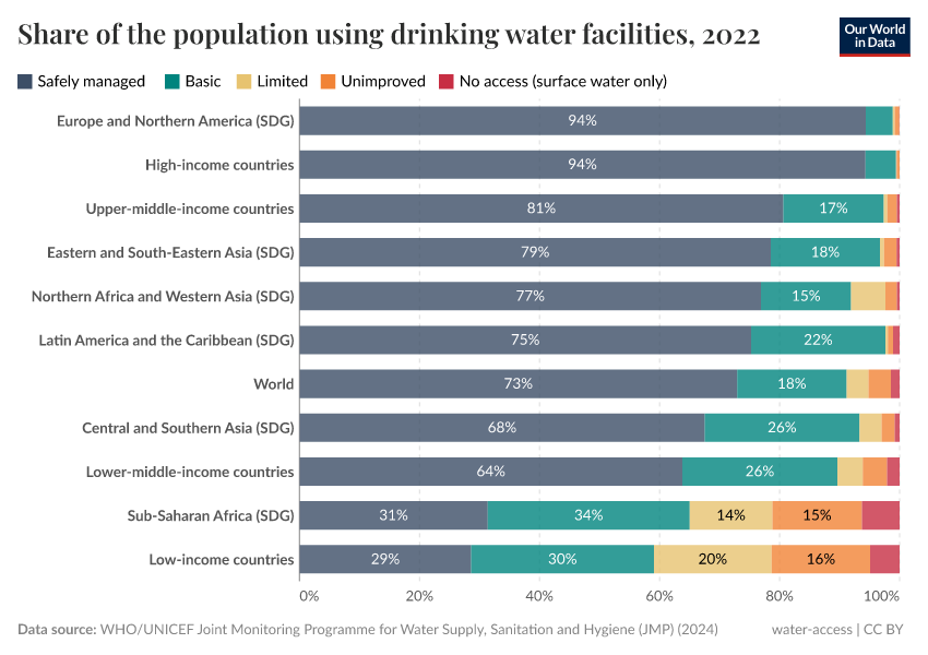 The following chart breaks down drinking water use globally and across regions and income groups. In countries with the lowest incomes, less than one-third of the population uses safely managed water. Most live in Sub-Saharan Africa.