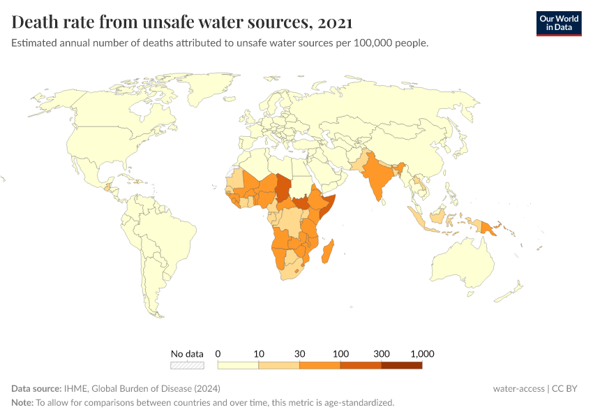 This map shows the death rates from unsafe water sources worldwide. Death rates measure the number of deaths per 100,000 people in a given country or region.