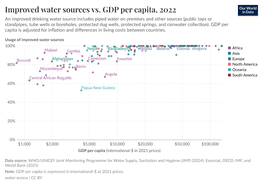 Typically, most countries with more than 90% of households with improved water have an average GDP per capita of over $10,000 to 15,000. Those at lower incomes tend to have a larger share of the population without access.