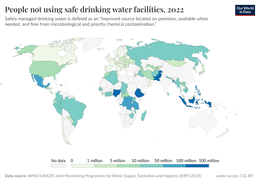 The map shows the number of people worldwide who do not use safe drinking water facilities.