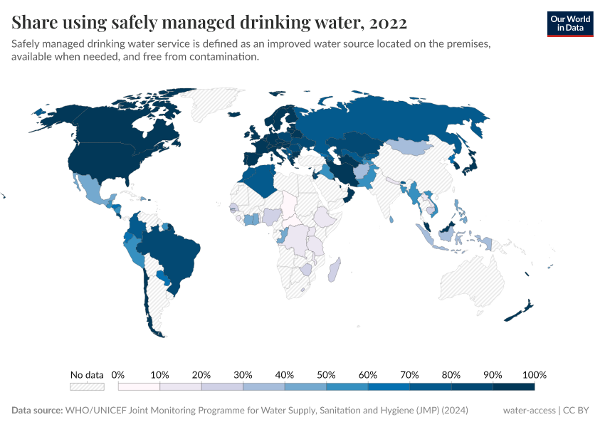 In the map shown, we see the share of people worldwide using safe drinking water facilities.