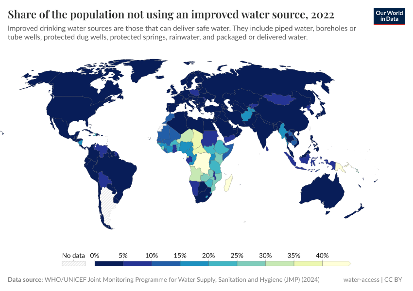 The map shows the share of people worldwide who do not use improved water sources.