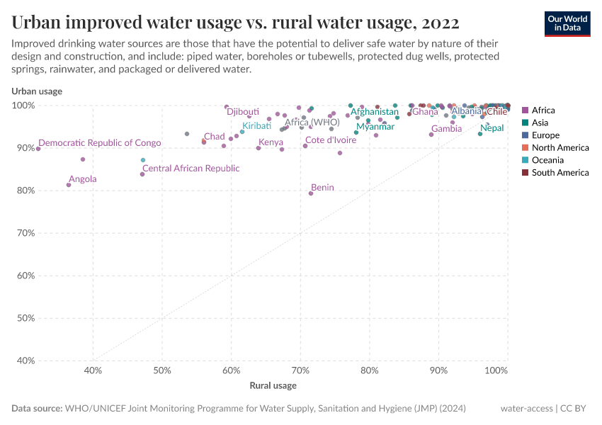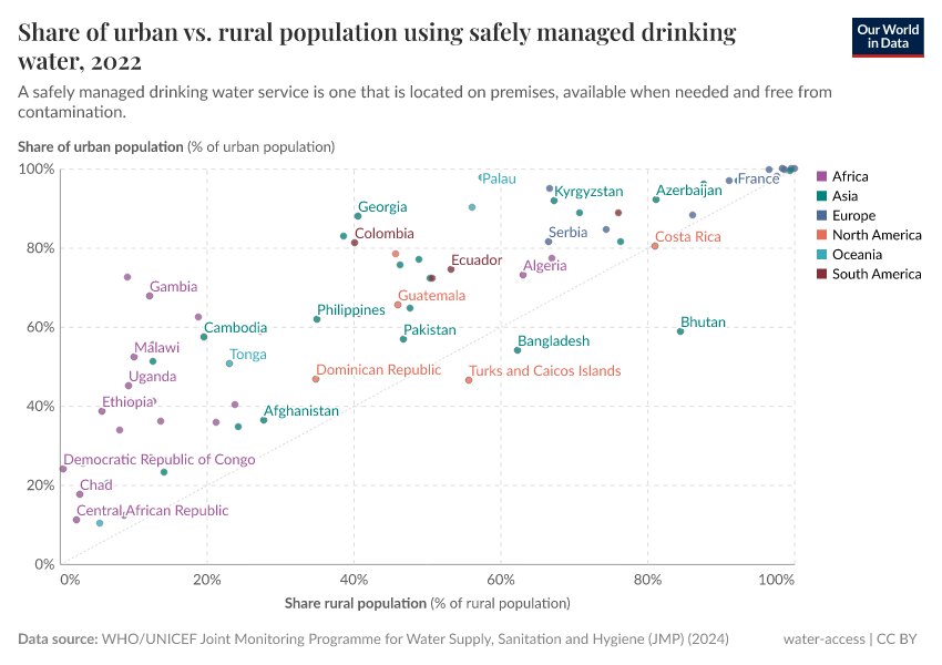 In addition to the significant inequalities in improved water usage between countries, there can also be large differences within countries. In the charts, we plotted the share of the urban versus rural population using improved water sources and safely managed drinking water, respectively. Here, we have also shown a line of parity; if a country lies along this line, then access in rural and urban areas is equal.