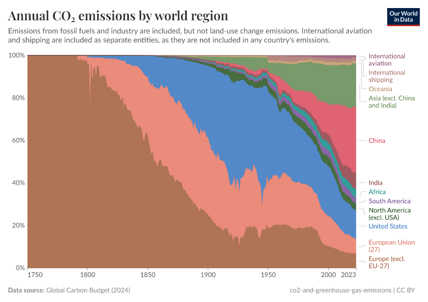 In the following chart, we see the change in the share of global cumulative emissions by region over time from 1751.