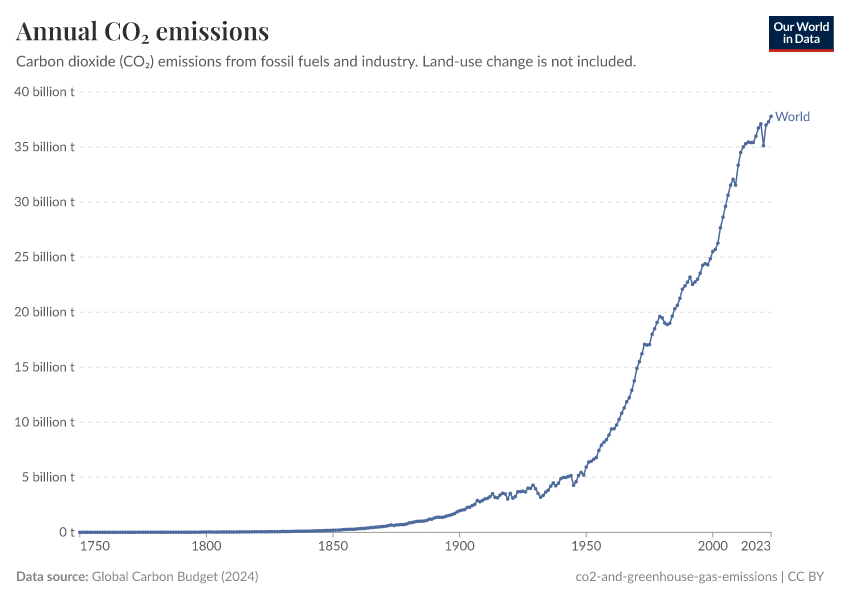 We see that before the Industrial Revolution, emissions were very low. Growth in emissions was still relatively slow until the mid-20th century. In 1950 the world emitted 6 billion tonnes of CO2. By 1990 this had almost quadrupled, reaching more than 20 billion tonnes. Emissions have continued to grow rapidly; we now emit over 35 billion tonnes each year. Emissions growth has slowed over the last few years, but they have yet to reach their peak.
