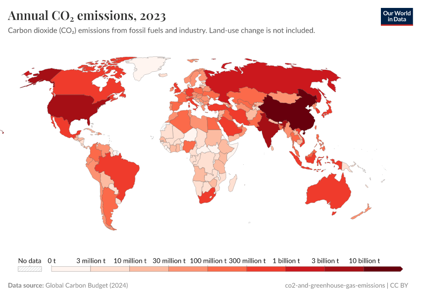 Annual CO2 emissions tell us how much each country emits in a given year. It shows us the geographical distribution of current emissions across the world.