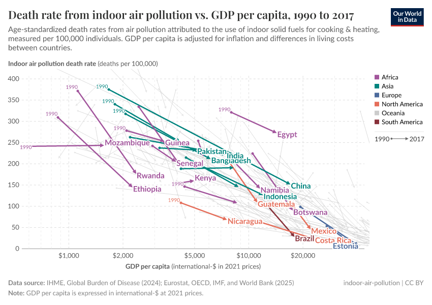 The world is solving this problem. We see this in the chart. Strong economic growth made people around the world richer, and the death rate from indoor air pollution declined.