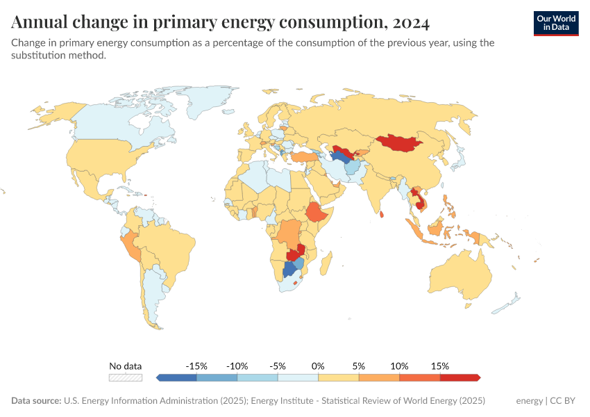 This interactive chart shows the annual growth rate of energy consumption. Positive values indicate a country's energy consumption was higher than the previous year. Negative values indicate its energy consumption was lower than the previous year.