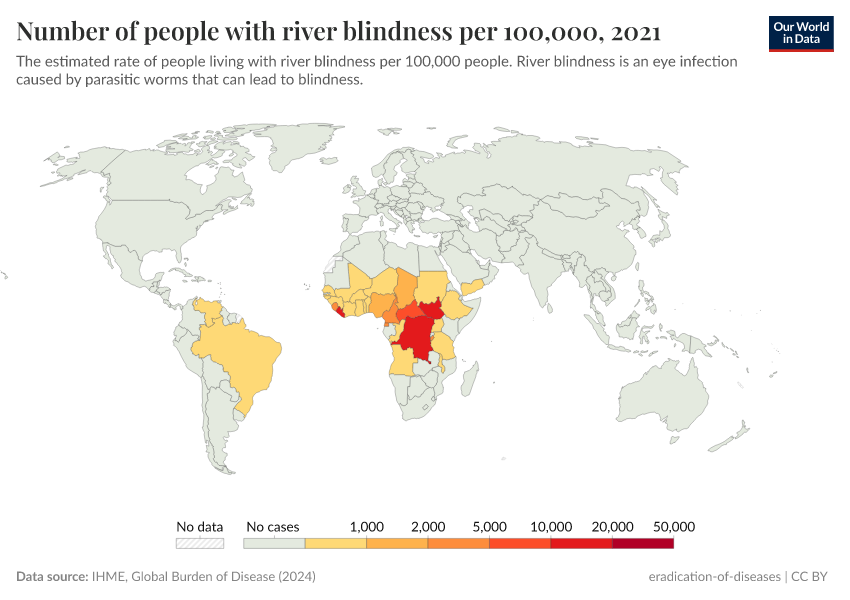 The map below shows the estimated prevalence of onchocerciasis worldwide. Limited information is available on the surveillance of the disease, and estimates come with significant uncertainty.