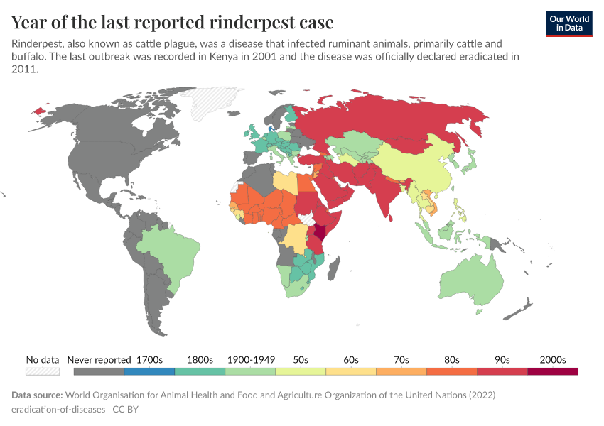 The map here shows the last year in which cases of rinderpest were reported in a country. In 1960 an English veterinary scientist Walter Plowright developed a vaccine against rinderpest, which finally led to its eradication.