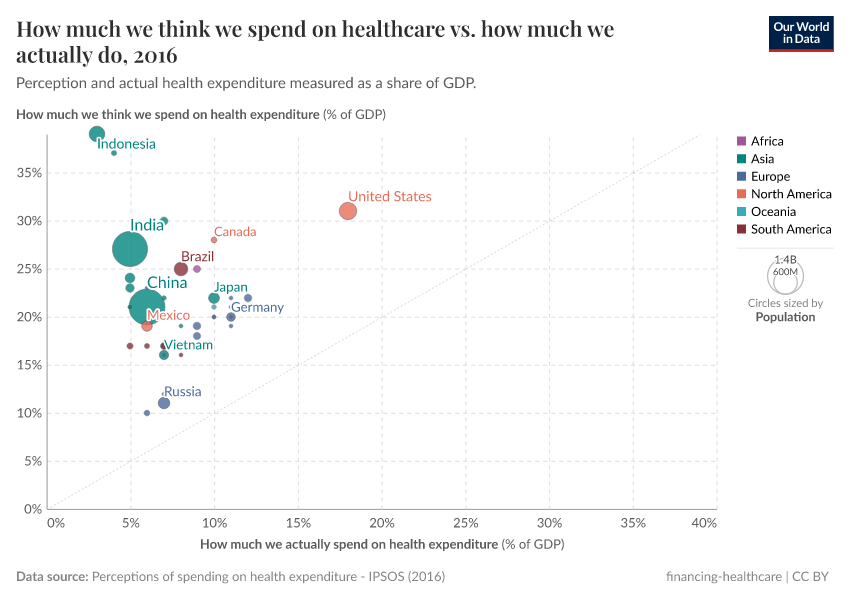 This is largely at odds with public perception of healthcare spending—all over the world, people grossly overestimate actual healthcare spending.