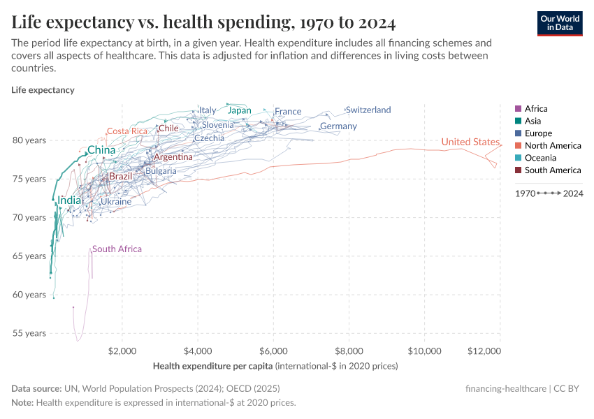 The association between health spending and increasing life expectancy also holds for rich countries in Europe, Asia, and North America in the upper right corner of the chart. The US is an outlier that achieves only a comparatively short life expectancy considering the fact that the country has by far the highest health expenditure of any country in the world. We will get back to this below.