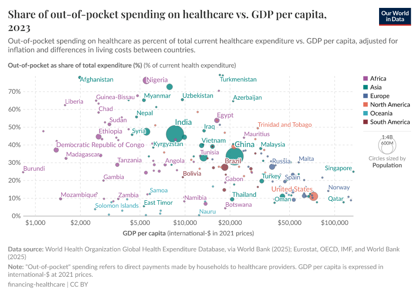 The visualization presents out-of-pocket expenditure on healthcare by country (as a percentage of total healthcare expenditure). As can be seen, in high-income countries these outlays tend to account for only a small fraction of expenditure on healthcare; while in low-income countries, they account for a large part of funding. Many countries have followed a clear path in the direction of reducing this type of expenditure (particularly in the developing world), yet some countries have moved in the opposite direction.
