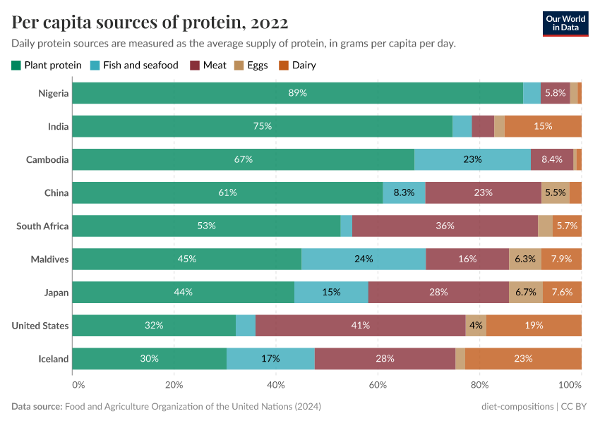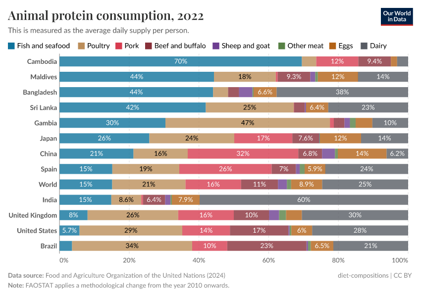 In some countries, seafood dominates. It accounts for the majority of animal protein in Cambodia, Bangladesh, and the Maldives.