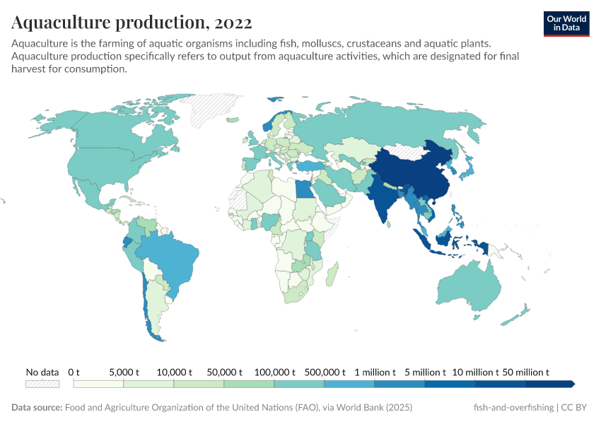 The two charts here show the distribution of fish farming (also known as ‘aquaculture’) by country. First is the global distribution, as shown on the map. Second, as in the regional breakdown, you can also add and compare countries using the “Edit countries and regions” button.