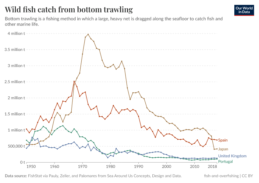 In contrast, bottom trawling is becoming less common across Europe. In many countries – such as the UK, Spain, and Portugal – bottom trawling was intense throughout the 1950s, 60s, and 70s but has since declined significantly. That has been partly driven by efforts to reduce overfishing and allow fish stocks to rebuild. In addition, the European Commission banned bottom trawling in deep waters – those below 800m in depth – in 2016.