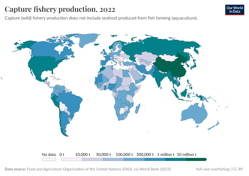 The chart here shows the distribution of wild fish catch by country. This is total seafood production minus aquaculture (fish farming).