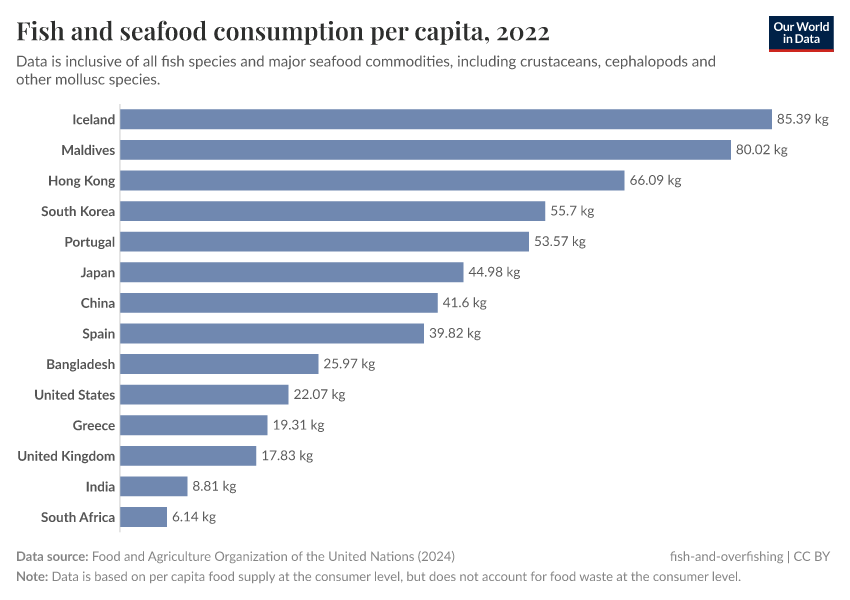 In the charts here, we see the average per capita consumption of fish and seafood across the world.6 The highest seafood consumers are countries including Iceland, the Maldives, and Hong Kong. Contrast that with those at the bottom of the table: landlocked countries such as Mongolia, Afghanistan, and Niger understandably eat relatively little fish.
