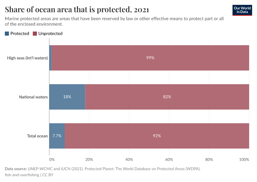 Here, we have to differentiate between national territorial waters – that is, parts of the ocean typically closer to coastlines that countries have national rights over – and international waters (also called the ‘high seas’) that do not belong to any single country. In the chart, we see the amount in each zone that is protected and unprotected.41
