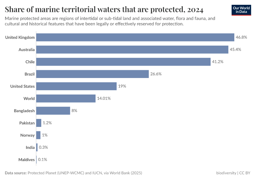 In the charts here, we see the share of territorial waters that are protected in each country. This does not include international waters (‘high seas’).