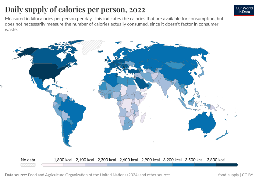 Max Roser, Hannah Ritchie, and Pablo Rosado (2013) - “Food Supply” Published online at OurWorldinData.org. Retrieved from: 'https://data-auxiliary-trade.owid.pages.dev/food-supply' [Online Resource]BibTeX citation