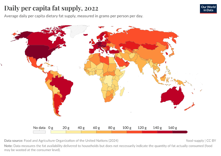 In this interactive map, we see the differences in how much fat each person gets every day in different countries.