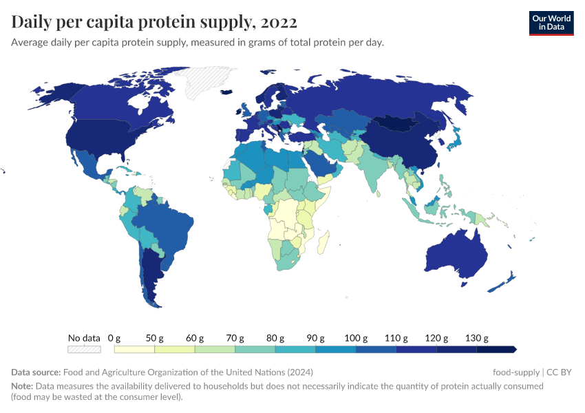 In this interactive map, we see the differences in how much protein each person gets every day in different countries.
