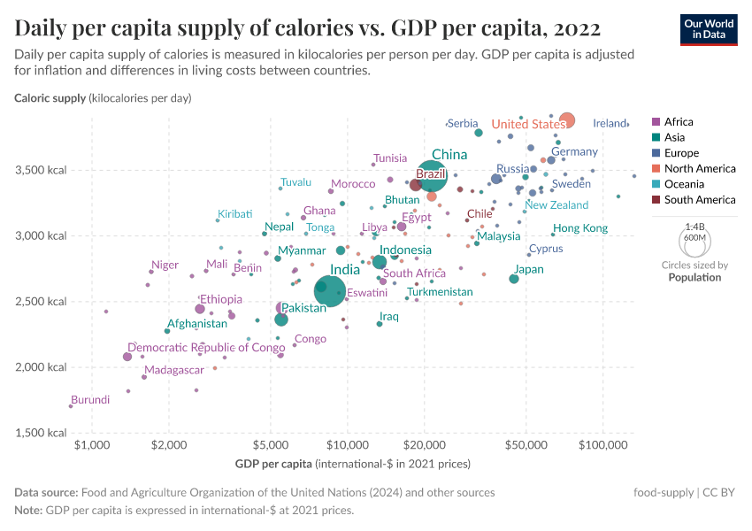 In the sub-sections below we have plotted the relationship between daily per capita food supply (in the form of calories, protein, and then fat) versus gross domestic product (GDP) per capita in 2011 international-$. Several countries selected across a range of income levels and global regions have been highlighted for comparison. For all three measures of food supply, we see a close correlation between per capita supply and prosperity. As we get richer, per capita supply tends to increase.