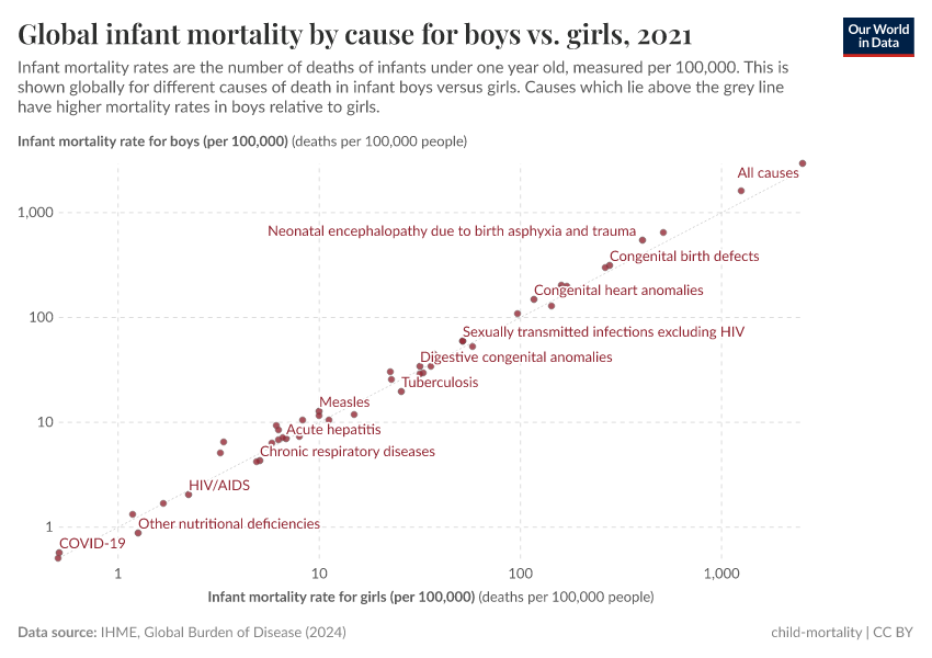 This is also the explanation reported by the World Health Organization: "Newborn girls have a biological advantage in survival over newborn boys. They have lesser vulnerability to perinatal conditions (including birth trauma, intrauterine hypoxia and birth asphyxia, prematurity, respiratory distress syndrome and neonatal tetanus), congenital anomalies, and such infectious diseases as intestinal infections and lower respiratory infections."
