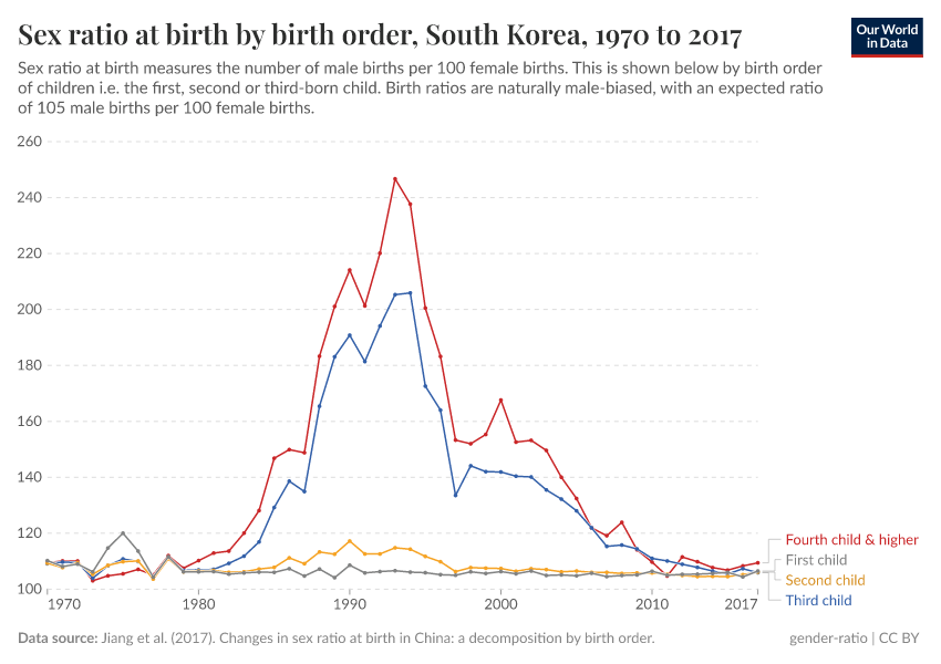 In this chart, we can see how the sex ratio in South Korea varies by birth order.